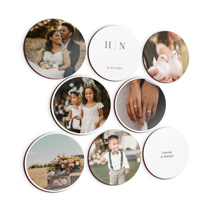 Personlig billedvæg - Rund- 8 stk Dekorer din væg med en flot billedvæg i træ…